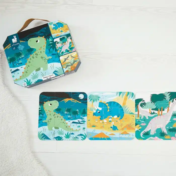 écouvrez le joli puzzle en bois 4 niveaux sur le thème des dinosaures de la marque française Janod. Ce puzzle 4 en 1 permet d’augmenter la difficulté en fonction des puzzles et du nombre de pièces progressivement sur un même thème.