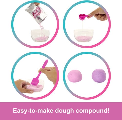 Continuez à « déballer » les cadeaux pour découvrir des tenues de fête, un adorable animal de compagnie avec un accessoire pour le déguiser et des ustensiles de décoration de gâteaux. Les jeunes créatifs pourront utiliser la pâte à modeler facile à préparer, le moule et les ustensiles pour réaliser des décorations pour le gâteau d’anniversaire à deux étages inclus et organiser une fête d’anniversaire pour leur animal de compagnie.