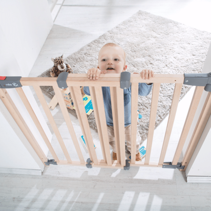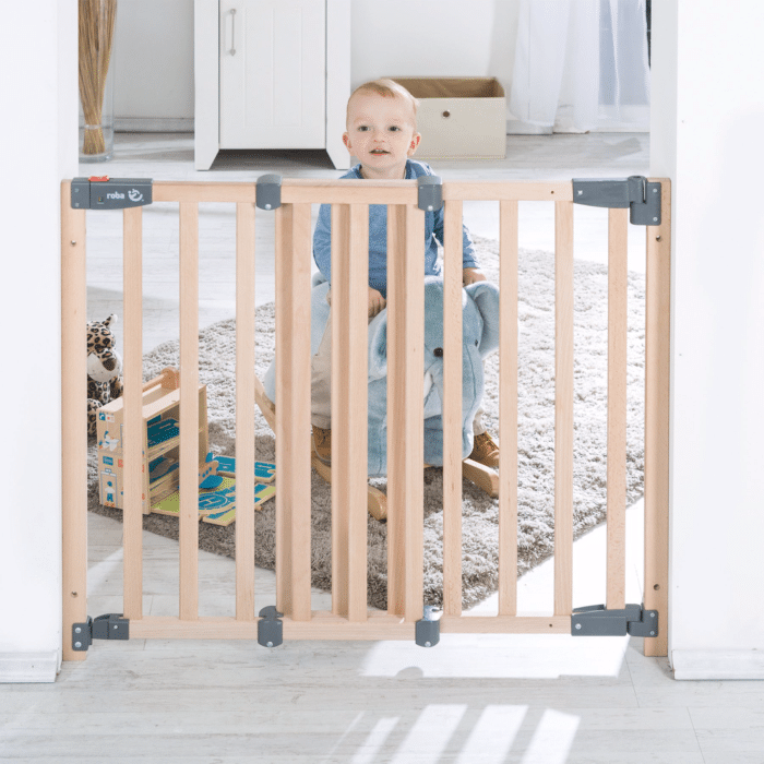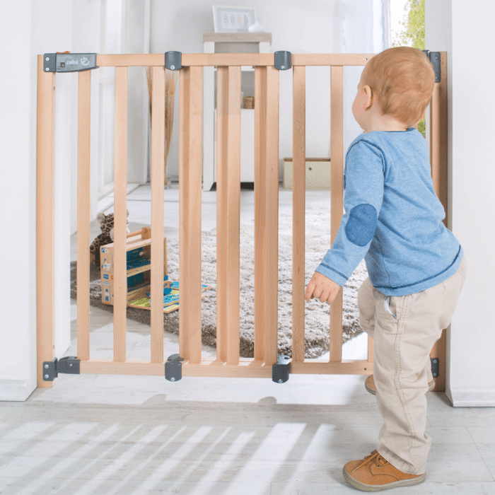 La barrière de sécurité de couleur naturelle avec une largeur de réglage variable de 78 à 100,5 cm peut être fixée de manière sûre et stable aux cadres de porte, aux poteaux d’escalier et aux murs.