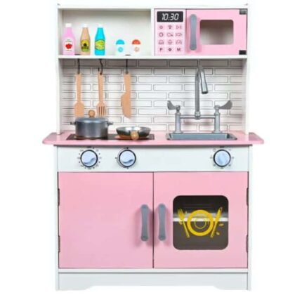 Des couleurs douces, un style unique et moderne aux formes arrondies, des possibilités de jeu multipliées grâce aux activités proposées de chaque côté de la cuisine, tout ceci combiné à de jolies fonctionnalités … c’est le rêve de tous les apprentis cuistots et maîtres de maison ! Son côté recto-verso est un véritable atout ! Elle permet d’offrir aux enfants à partir de 3 ans un formidable terrain de jeu, seul ou à plusieurs en s’inventant des histoires côté cuisine comme côté lingerie ! Cette cuisinière Cooker Reverso a fait le plein d’équipements : un évier en métal et une plaque à induction sonore et lumineuse. Il suffit d’appuyer une fois sur les boutons rouges pour que les plaques s’allument, puis une deuxième fois pour entendre le son de l’eau qui bout. Le son et la lumière s’éteignent automatiquement au bout de 30 secondes ou lorsqu’on appuie une troisième fois. Pour l’aspect réaliste, on retrouve également 2 boutons rotatifs avec bruitage, un four, un micro-onde, un placard avec portes magnétiques. Pour compléter cette belle cuisine, 7 accessoires en métal sont inclus : 1 poêle, 1 casserole, 1 passoire, 1 cuillère, 1 spatule, 1 cuillère écumoire, 1 cuillère à pâtes et enfin 1 manique en tissu. Au verso, on découvre l’univers nettoyage du linge avec la machine à laver, les étagères de rangement, une horloge avec aiguilles à tourner et 2 boutons de programmation avec bruitages !