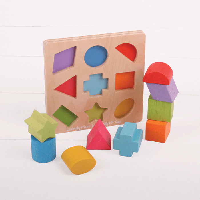 Associez chacune de ces grosses formes en bois aux couleurs vives à la bonne fente sur la planche de base. Une fois la récréation terminée, tous les blocs peuvent être stockés dans le plateau de base.
