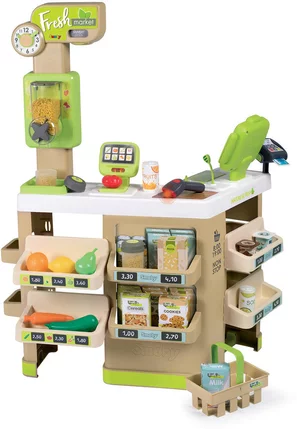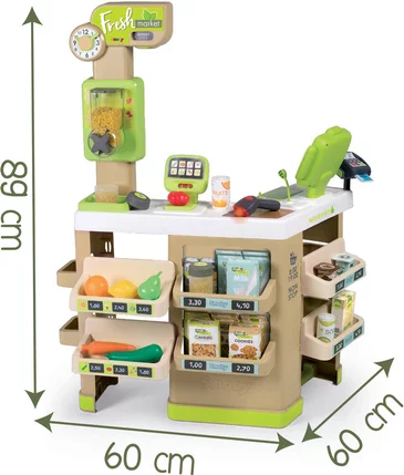 Avec la Fresh Market tu pourras créer ton propre magasin bio ! De nombreux espaces de jeu composent cette marchande, te permettant ainsi de te plonger dans la peau d’un véritable vendeur ! En plus du coin fruits/légumes, et du passage en caisse, tu pourras t’amuser à peser tes légumes grâce à la balance mécanique : le poids affiché s’ajuste en fonction des aliments pesés ! Le distributeur de nourriture en vrac te plaira tout autant. Tu peux le remplir de noisettes, graines, ou petites pâtes, et utiliser la molette pour les faire tomber dans des bocaux. La caisse enregistreuse possède 1 tiroir-caisse, 1 micro factice et 1 lecteur de carte bancaire. De nombreux accessoires sont inclus pour agrémenter les fonctions de jeu : 4 boites factices, 6 fruits et légumes, 2 pots de yaourt, 2 canettes, 2 bocaux, 1 lecteur de code-barres électronique avec son et lumière, 1 carte bancaire, 4 tégumes, 2 pots de yaourt, 2 canettes, 2 bocaux, 1 lecteur de code-barres électronique avec son et lumière, 1 carte bancaire, 4 tickets de caisse, 9 pièces, 12 billets, et 1 panier.