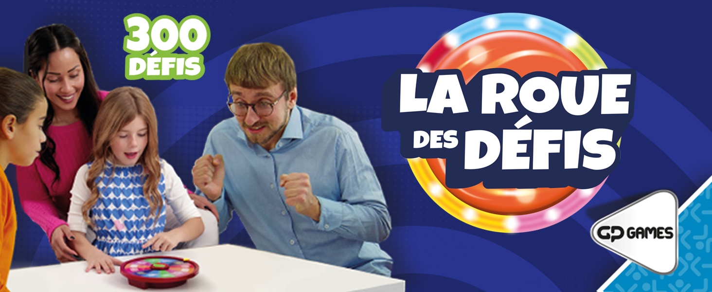 La roue des défis, 300 défis à réaliser dans 6 catégories différentes : Quiz sur un son, Action, Vrai/Faux, Famille/Amis, Devine, Surprise. Lance la roue pour découvrir ton défis et marquer un max de points.Idéal pour réunir la famille, le système s’occupe de tout : annonce les défis et compte les points. De 2 à 6 joueurs. Durée de 15 à 20 min.