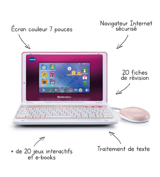 Genio reprend les codes des vrais ordinateurs : interface, clavier AZERTY, souris, écran 7″, mémoire de 8 Go3 extensible jusqu’à 40 Go avec une carte microSD (non incluse). Il possède plus de 50 activités et applications dont un vrai logiciel de traitement de texte pour faire ses devoirs et s’amuser. 20 fiches de révision sur différents thèmes (écriture, mathématiques, histoire, anatomie, etc..) sont également incluses.
