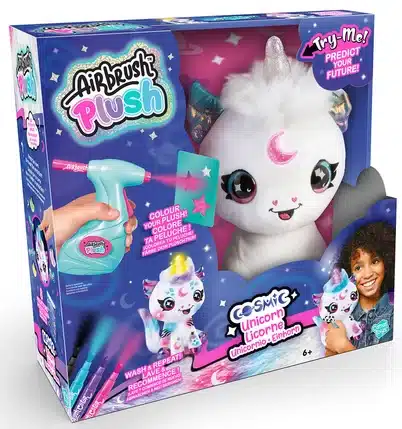 Amuse-toi à personnaliser ta peluche à l’aide de ton spray, de tes feutres et de tes pochoirs. Lave ta peluche et recommence à l’infini ! Pose une question et appuie sur sa corne : elle s’illumine ! Déchiffre la réponse grâce à la carte des prédictions !