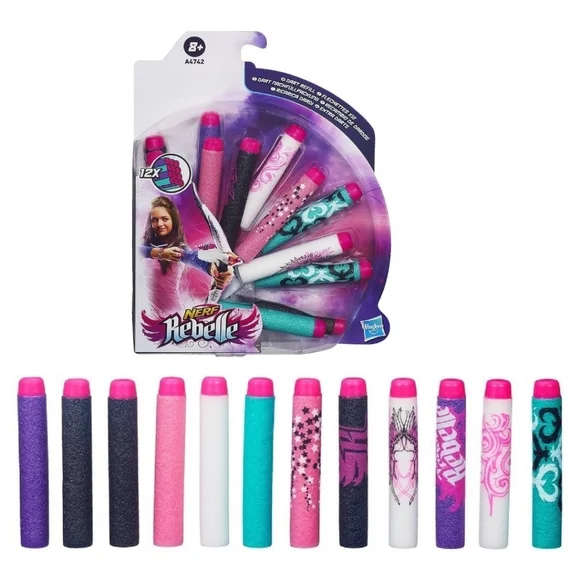 Pack de 12 fléchettes de rechange : 6 fléchettes décorées et 6 fléchettes de couleurs différentes. Pour Nerf Rebelle Blasters