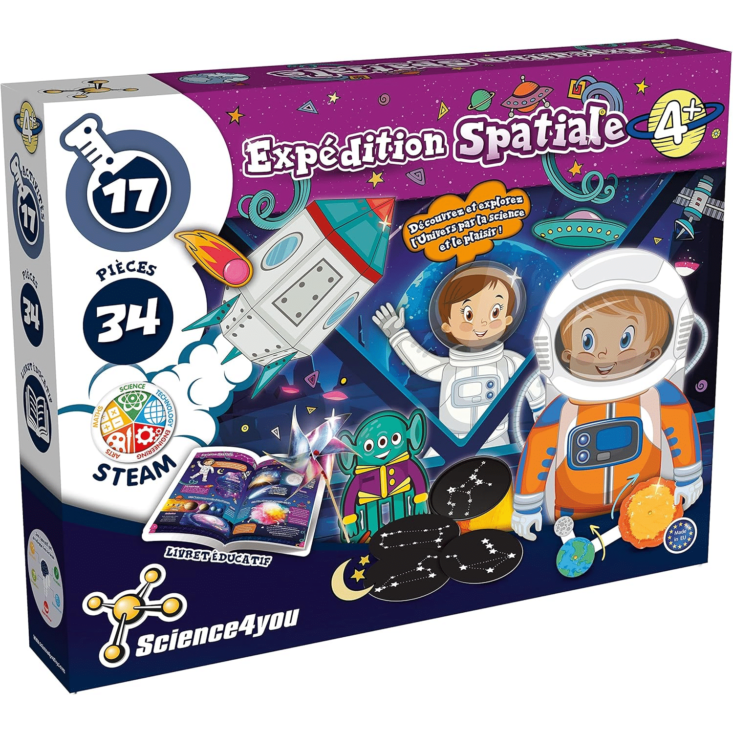 EXPÉDITION SPATIALE : Découvrez 17 activités scientifiques et ludiques pour vos petits grâce à notre jeu créatif. Le livret pédagogique de 36 pages, illustré et en couleurs, vous accompagnera dans vos aventures.