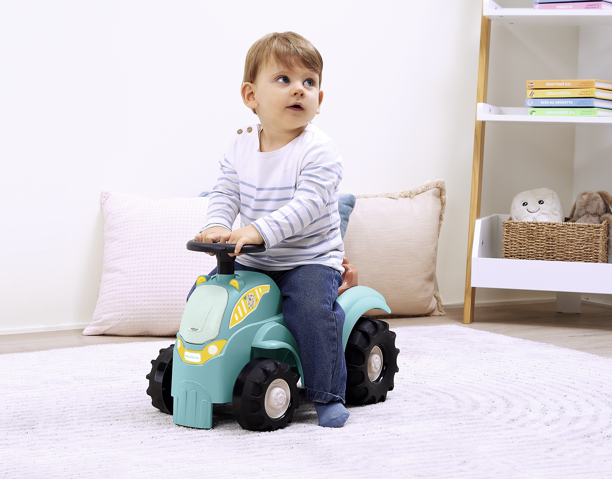 Ce coffret comprend un grand véhicule de jeu avec des pièces mobiles. Le tracteur est bleu avec des éléments colorés. Il est équipé d’ un siège adapté aux enfants de 12 à 36 mois, d’ un espace de rangement pour les petits trésors et de roues en plastique mobiles. Ses dimensions sont de 50,5 x 28,5 x 32,5 cm .